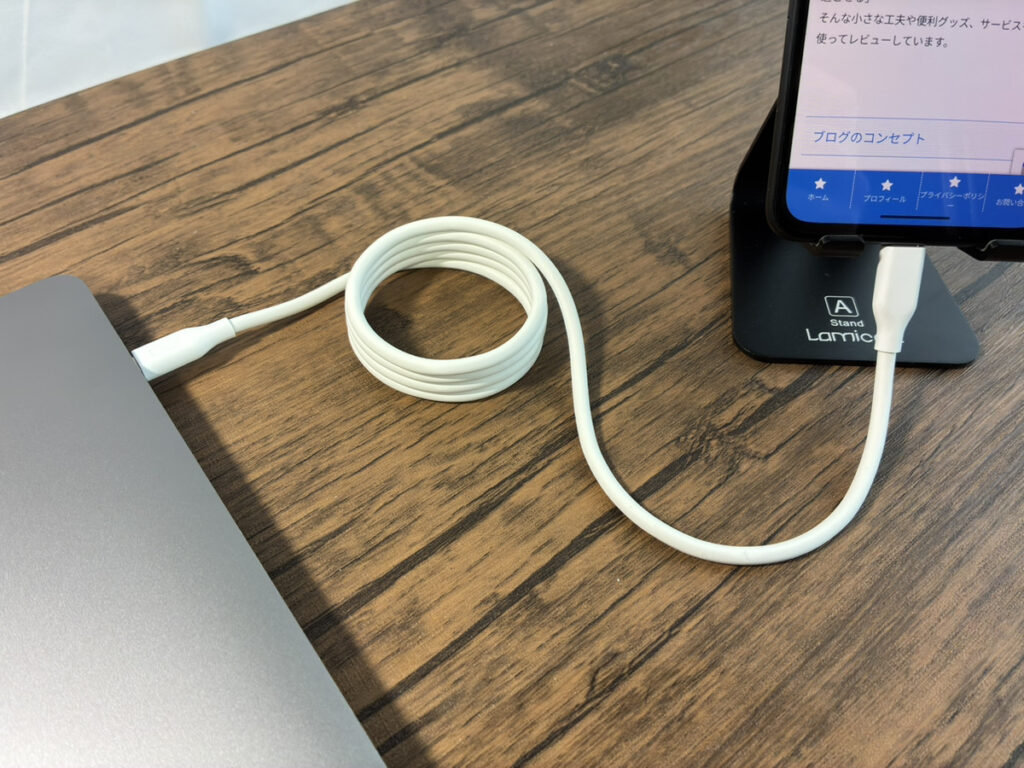 一般的な長めのケーブルだと、余った部分が机の上で邪魔になったり、見た目がごちゃついたりしがちですが、このケーブルは余分な長さをまとめたまま使いやすく、デスク周りをすっきりさせることができました。