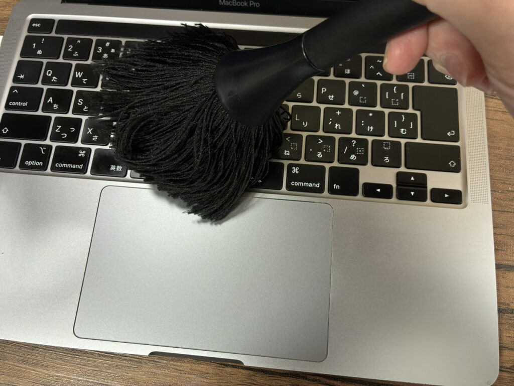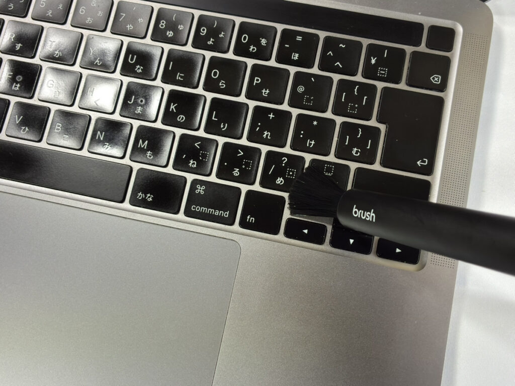 最初に硬い毛の方で、Macのキーボードのキーの間やキーの溝を掃きました。最後に柔らかい毛の方でキーボード全体を掃いて出てきたほこりを取り除きました。