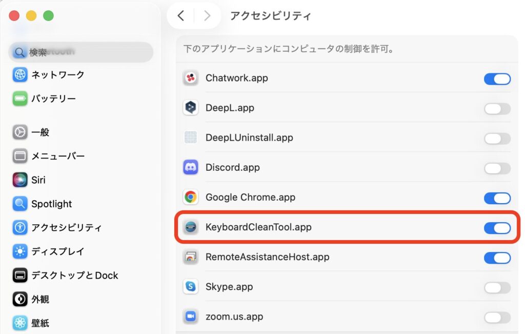 設定アプリにて、アクセシビリティが表示されますので、KeyboardCleanToolを「オン」にします。