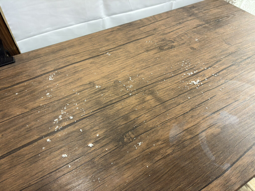 私の場合、仕事のデスクで食事をする際に、ゆで卵に塩をふりかけることがありますので、デスク上に塩を振りまいた状態で掃除を行います。
