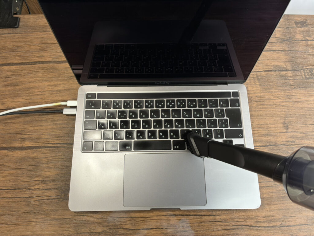 その点、ハンディクリーナーは払う動作と吸い取る動作を同時に行えるため、キーボード掃除の時間を短縮できました。